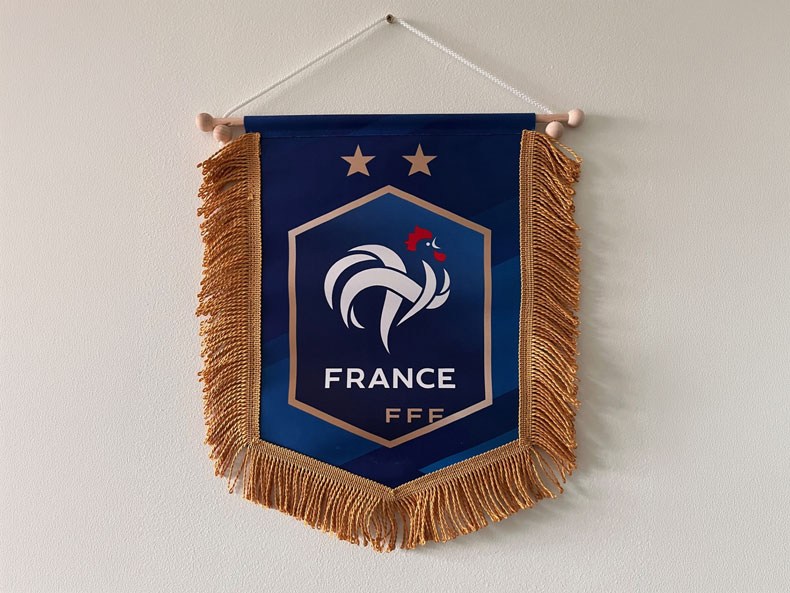 - Dwustronne drukowane również na dwóch kawałkach dzianiny, a zamiast czarnej przekładki wszywamy polietylenową nienasiąkliwą piankę o grubości 10mm. Pianka usztywnia chorągiewkę dzięki temu jest ona rozpostarta w wietrzne i bezwietrzne dni.