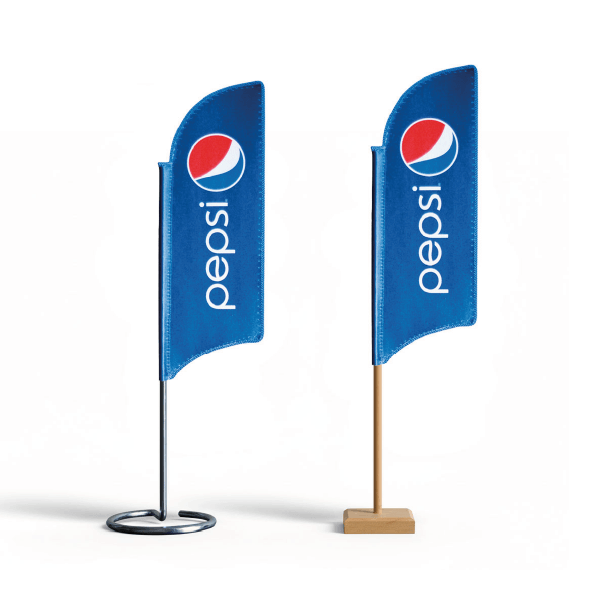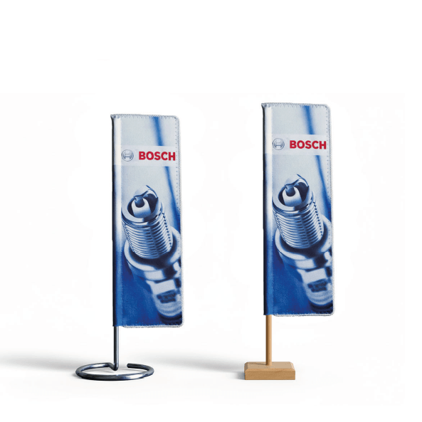Posiadamy bardzo bogatą ofertę tzw. mini flag. Są to proporczyki stołowe zawieszone na metalowych lub drewnianych stojaczkach, proporczyki sportowe obszyte złotymi frędzlami mające różne kształty, flagietki o małych wymiarach mocowane do drucianych podstaw i batfaniki w różnych formach i wymiarach na stojakach, masztach z przyssawką lub magnesem.