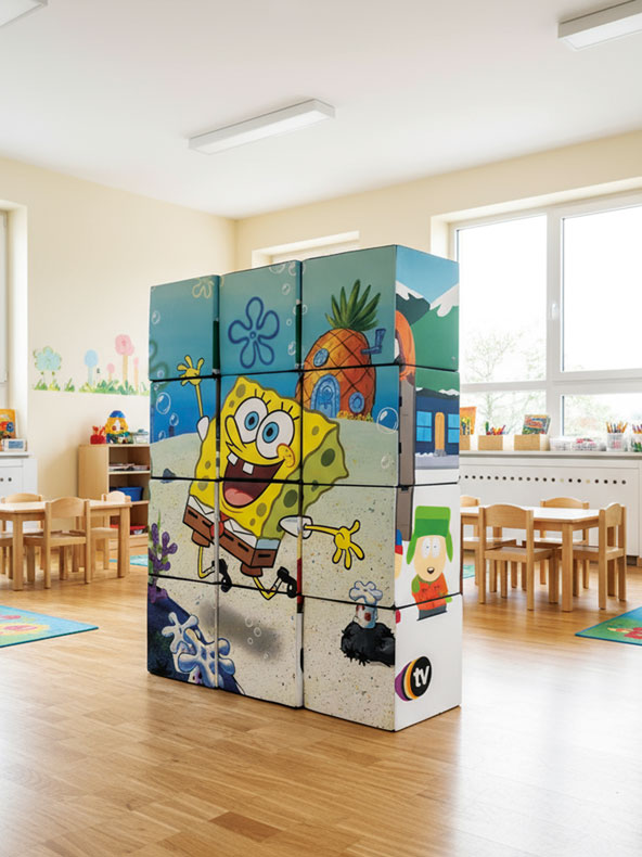Standardowo klocki mają 2 rozmiary wielkości: 40×40 lub 50×50 cm. Można zamówić klocki z indywidualnym nadrukiem.
